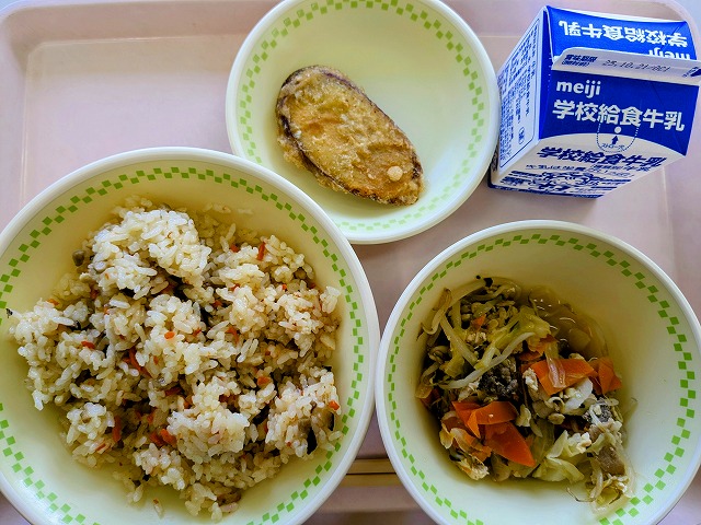 いも天(てん)ぷらをたべてお腹(なか)のなかもお肌(はだ)もきれいにしましょう。【今週の給食「ひとくちメモ」より】