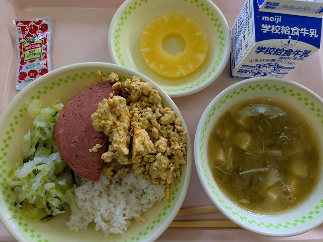 【今日の給食】1月9日(金) 2026年1月9日 ★沖縄の定番料理といえば みなさん、こんにちは。 ポーク玉子は、沖縄で親しまれている家庭料理です。ポーク缶は戦後 に広まり、食文化のひとつになりました。 卵で、タンパク質もしっかりとることができます。 アーサは沖縄の海藻で、ミネラルが豊富です。 沖縄の味を感じながら食べましょう。 【今週の給食「ひとくちメモ」より】