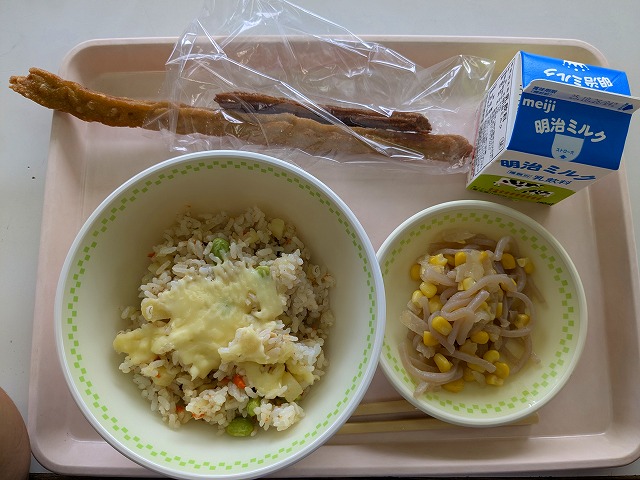今日(きょう)は、10月30日の世界(せかい)のウチナーンチュの日(ひ)にちなんだメニューでアメリカ料理(りょうり)を出(だ)しています。世界(せかい)のウチナーンチュの日(ひ)とは、沖縄(おきなわ)と沖縄(おきなわ)にルーツを持(も)つ人々(ひとびと)が「ウチナーネットワーク」でつながり、互(たが)いを祝(いわ)い、誇(ほこ)りを持(も)ち沖縄(おきなわ)に思(おも)いをめぐらす日(ひ)です。100年(ねん)以上前(いじょうまえ)、たくさんの人たちがハワイや南米(なんべい)など世界(せかい)の国々(くにぐに)へ出(で)かけ、暮(く)らしをつくりました。今(いま)では、約(やく)42万人(まんにん)のウチナーンチュが世界(せかい)で暮(く)らしています。みなさんは将来(しょうらい)、世界(せかい)の人(ひと)と交流(こうりゅう)するとしたらどんな「沖縄(おきなわ)のこと」をつたえたいですか?今日(きょう)の給食(きゅうしょく)は考(かんが)えながらたべてみてください。【今週の給食「ひとくちメモ」より】