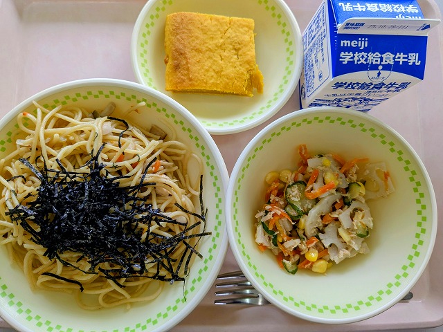 昔(むかし)の沖縄(おきなわ)は、琉球(りゅうきゅう)王国(おうこく)と呼(よ)ばれ、王様(おうさま)が中国(ちゅうごく)から色々(いろいろ)な品物(しなもの)を取(と)り寄(よ)せていました。その中(なか)にあった麺(めん)に、王様(おうさま)の料理人(りょうりにん)が工夫(くふう)を加(くわ)えて、作(つく)り出(だ)したのが「沖縄(おきなわ)そば」だと言(い)われています。「沖縄(おきなわ)そば」は王様(おうさま)の食(た)べ物(もの)だったのです。【今週の給食「ひとくちメモ」より】