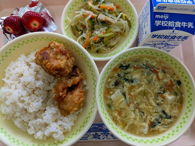 【今日の給食】2月20日(金) 2026年2月20日 ★今帰仁村産いちご 今帰仁村でいちごがつくられているのを知っていましたか? 村の農家さんが、温度や水の管理を工夫しながら、丁寧に育てています。いちごにはビタミンCが多く 体を元気にするはたらきがあります。 新鮮で甘いいちごが食べられるのは、農家さんの努力のおかげです。 地元の恵みに感謝して味わって食べましょう。【今週の給食「ひとくちメモ」より】