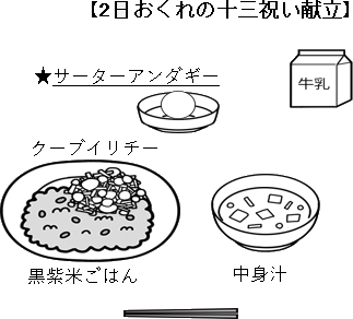 【今日の給食】2月27日(金) 2026年2月27日 ★十三祝い 「十三祝い」とは数え年で13歳になったことを祝う、沖縄ならではの成長のお祝いです。 沖縄では、13歳になると「子どもから大人への一歩をふみだす大切な節目」と 考えられていました。そのため十三祝いは、健康に成長したことへの感謝と、 これからの幸せや行事を願う行事として、家族や親戚でお祝いします。 十三祝いは、年齢を重ねることだけでなく、人とのつながりや感謝の心を 大切にする沖縄の文化を感じられる行事です。【今週の給食「ひとくちメモ」より】
